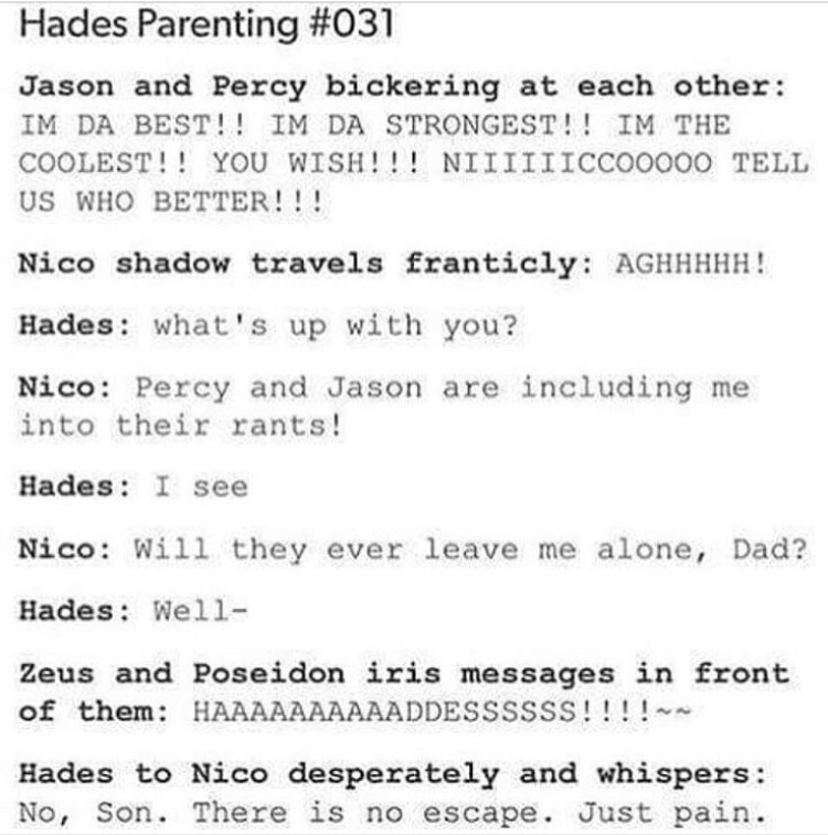 Hades hades parenting hades nico di angelo memes. May 23 2016 explore saywecanfly fangirl s board hades greek god on pinterest. Maria di angelo hades 5 nico di angelo reyna avila ramírez arellano 5 hades persephone percy jackson 5 include additional tags fluff 7 hades is a good parent 6 angst 5 alternate universe 4 family 4 character study 4 canonical character death 4 father son relationship 4. Bekijk meer ideeën over boeken fandoms rick riordan. See more ideas about percy jackson fandom percy jackson memes percy jackson funny. Jan 26 2020 explore zoeycgreen s board hades and persephone followed by 671 people on pinterest. All this time the meeting was suppose to happen no matter what. 12 feb 2020 bekijk het bord solangelo van san op pinterest.